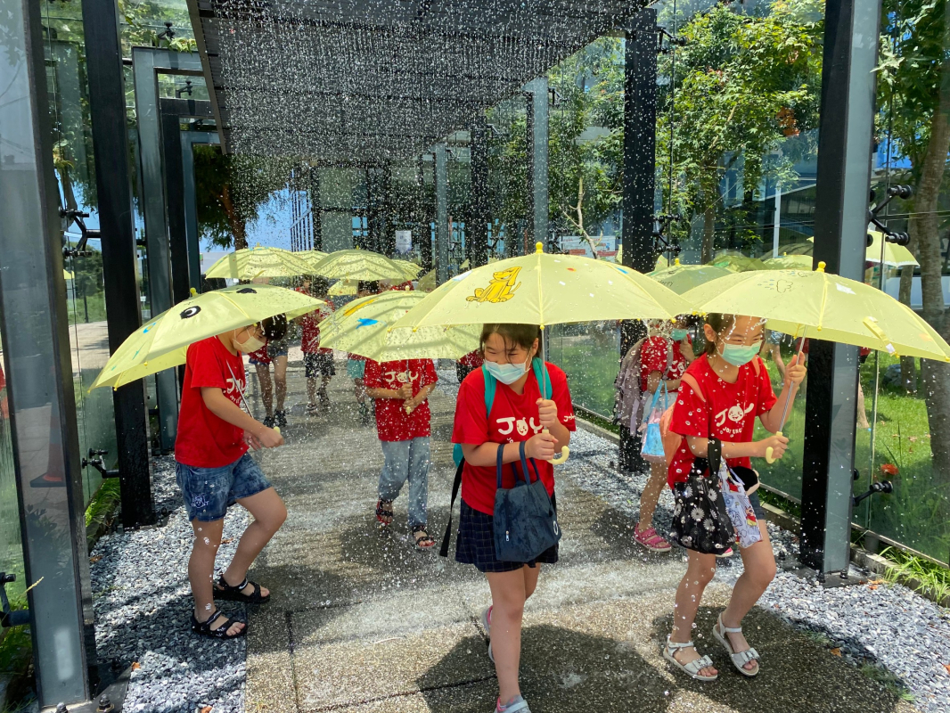 國巨洋傘文創園區建置有全台唯一的降雨體驗廊道,可親身撐傘走過不同模擬的每小時時雨量,分為大雨40mm、豪雨70mm、大豪雨120mm、超大豪雨180mm/HR共四種降雨,是由中央氣象局技術指導。 運用洋傘提供相關體驗活動,提供遊客五感體驗,透過真實體驗教育遊客專業知識產生品牌價值。 噴灑的水為「貯留型雨水貯留系統」雨水回收再利用,運用雨水貯留磚(雨水積磚)將雨水回收、過濾、貯留再利用,形成一個永續水循環模式,總儲水量可達8噸。